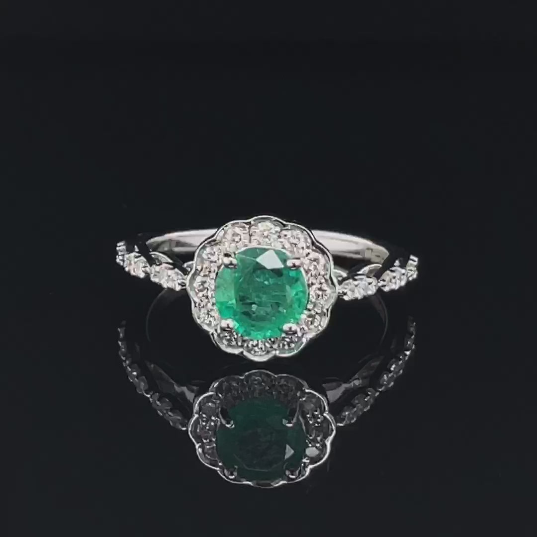 This breathtaking piece has an 18ct white gold band with nine diamonds on each shoulder and a beautiful round emerald as the centre stone. The emerald is surrounded by a halo of round brilliant diamonds in an art-deco style, that gives this ring an extra touch of elegance and class! This ring is definitely a show-stopper and is sure to wow!