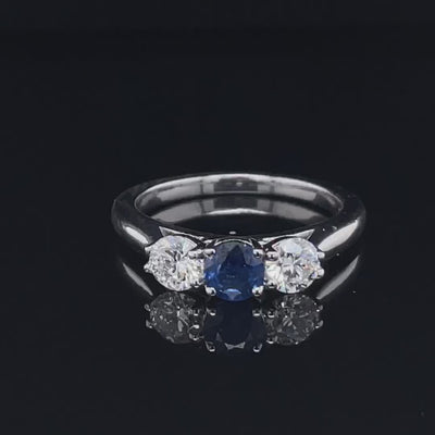 This elegant design features two stunning round brilliant diamonds and a centre Sapphire stone.